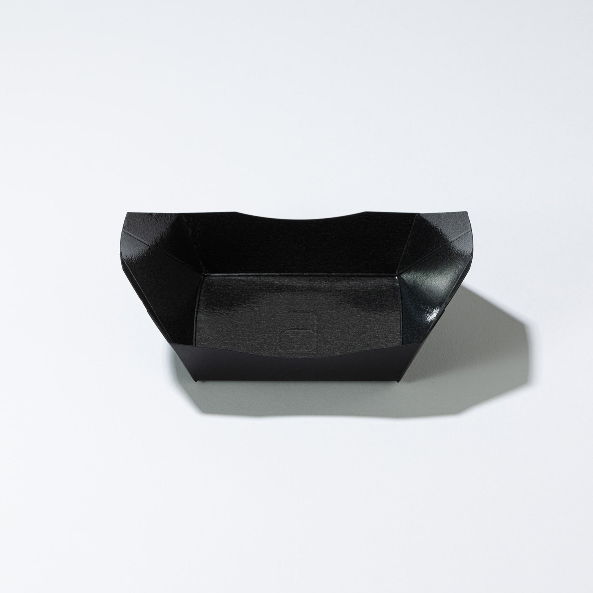 商品説明:高級感とシャープさを演出できるブラックカラーの舟型紙トレー。内側にはPP(ポリプロピレン)貼り加工を施しており、油分に強く、テイクアウト・フードイベント・屋台メニューにもぴったりです。