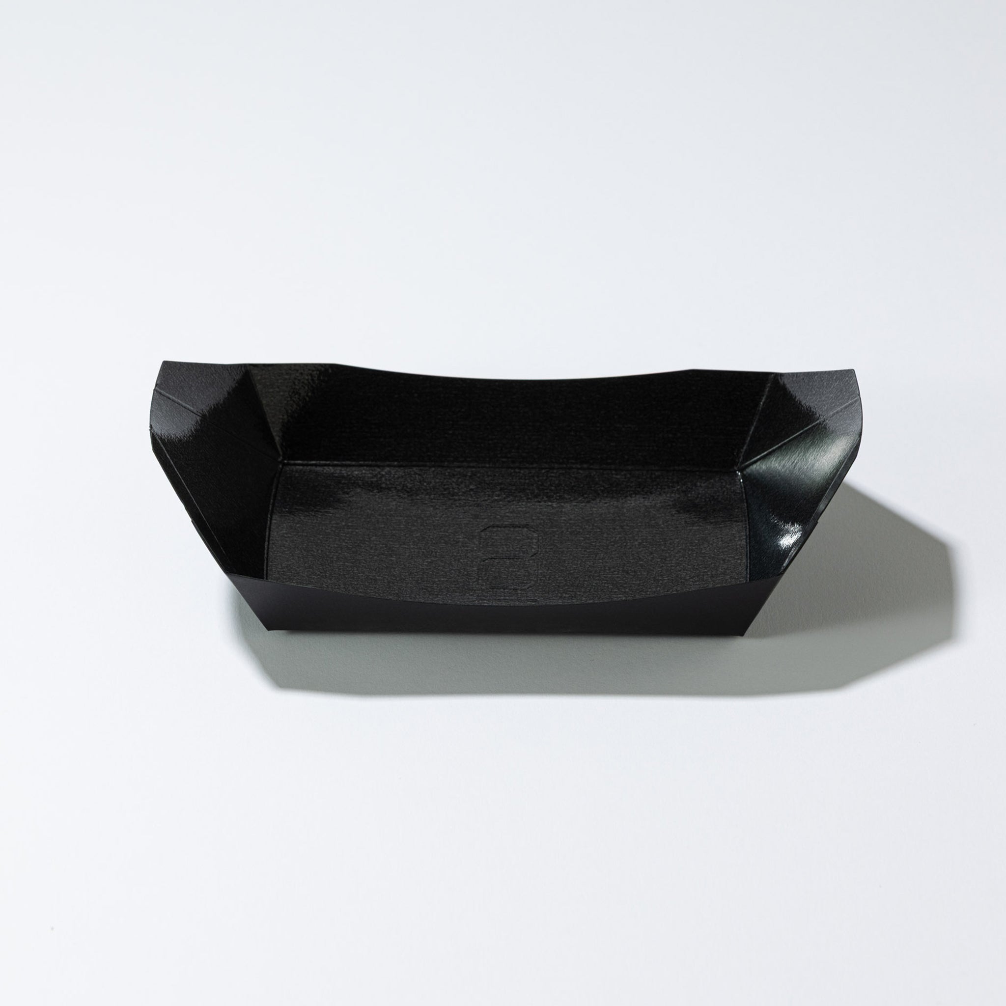 商品説明:高級感とシャープさを演出できるブラックカラーの舟型紙トレー。内側にはPP(ポリプロピレン)貼り加工を施しており、油分に強く、おしゃれな雰囲気で、テイクアウト・フードイベント・屋台メニューにもぴったりです。