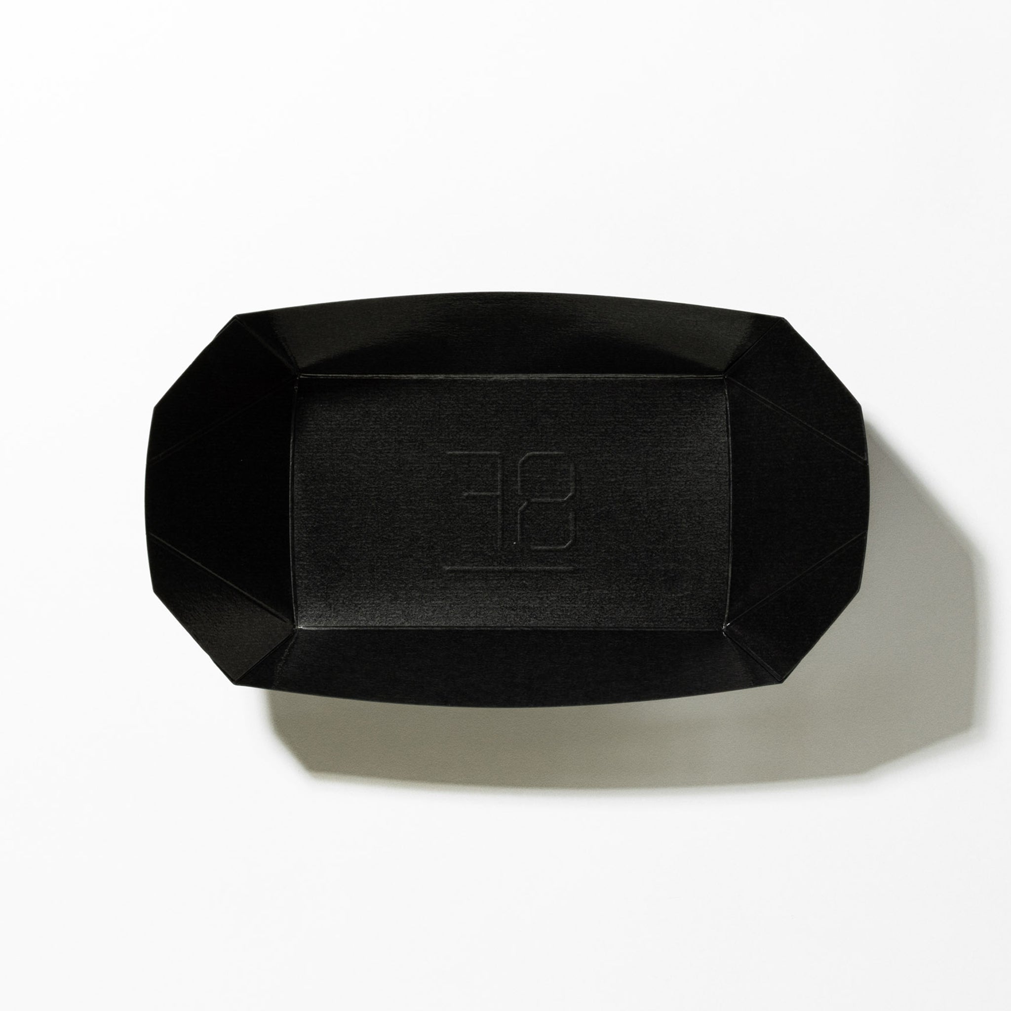 商品説明:高級感とシャープさを演出できるブラックカラーの舟型紙トレー。内側にはPP(ポリプロピレン)貼り加工を施しており、油分に強く、おしゃれな雰囲気で、テイクアウト・フードイベント・屋台メニューにもぴったりです。
