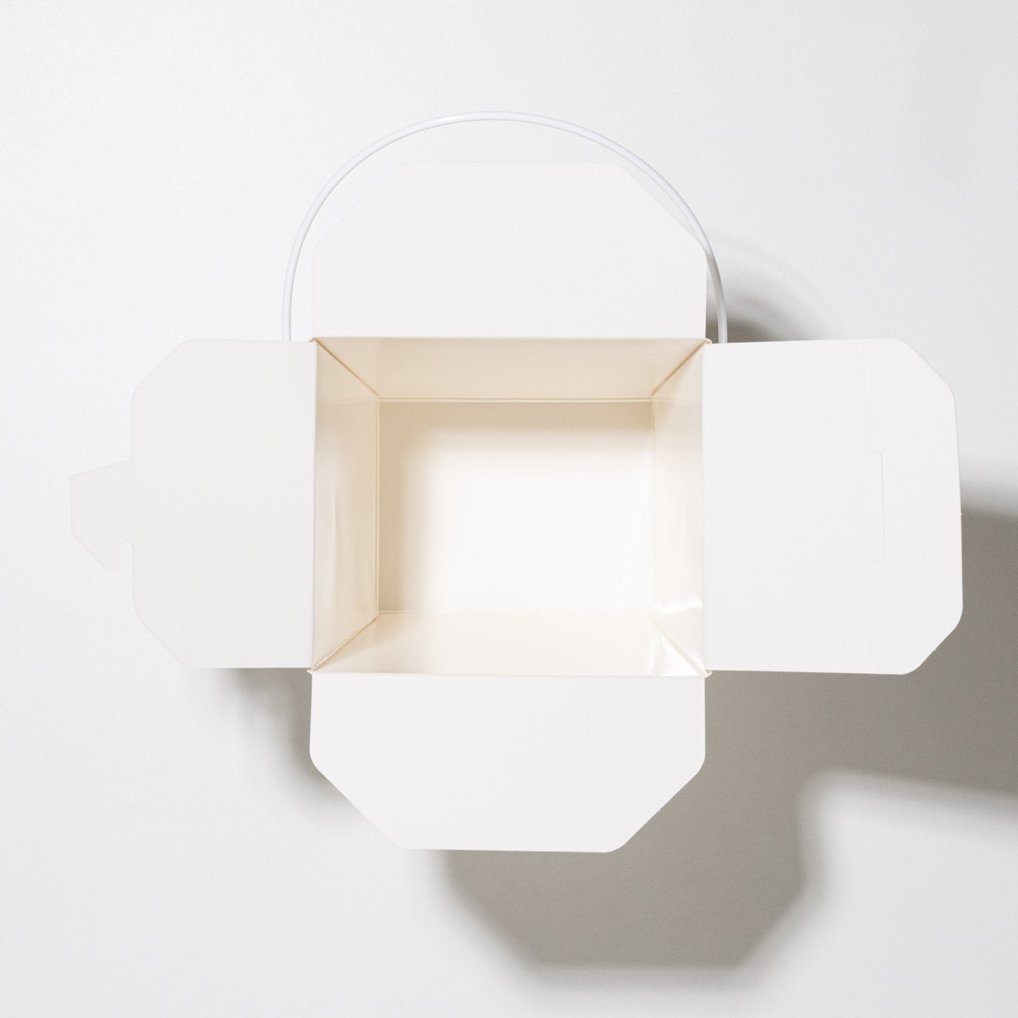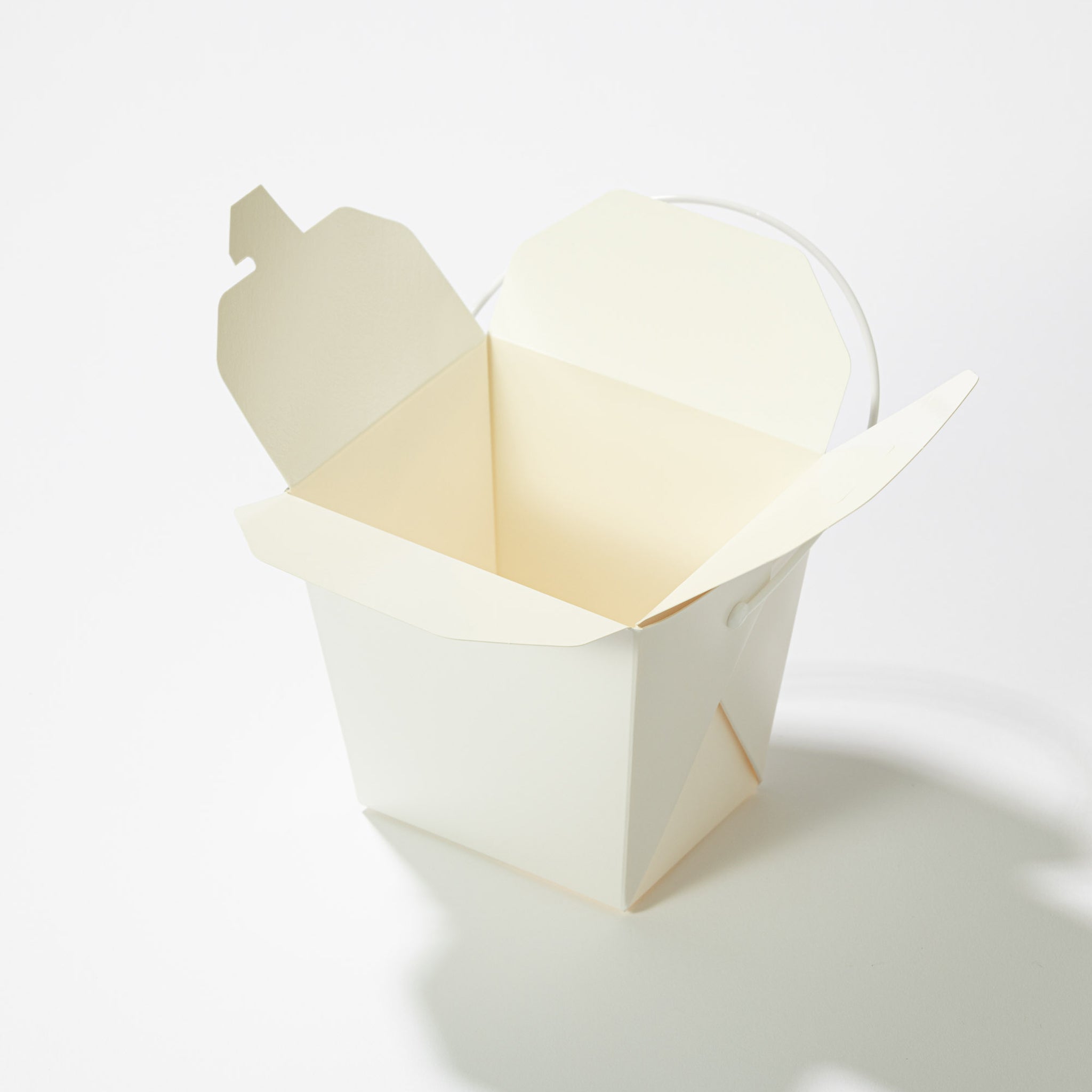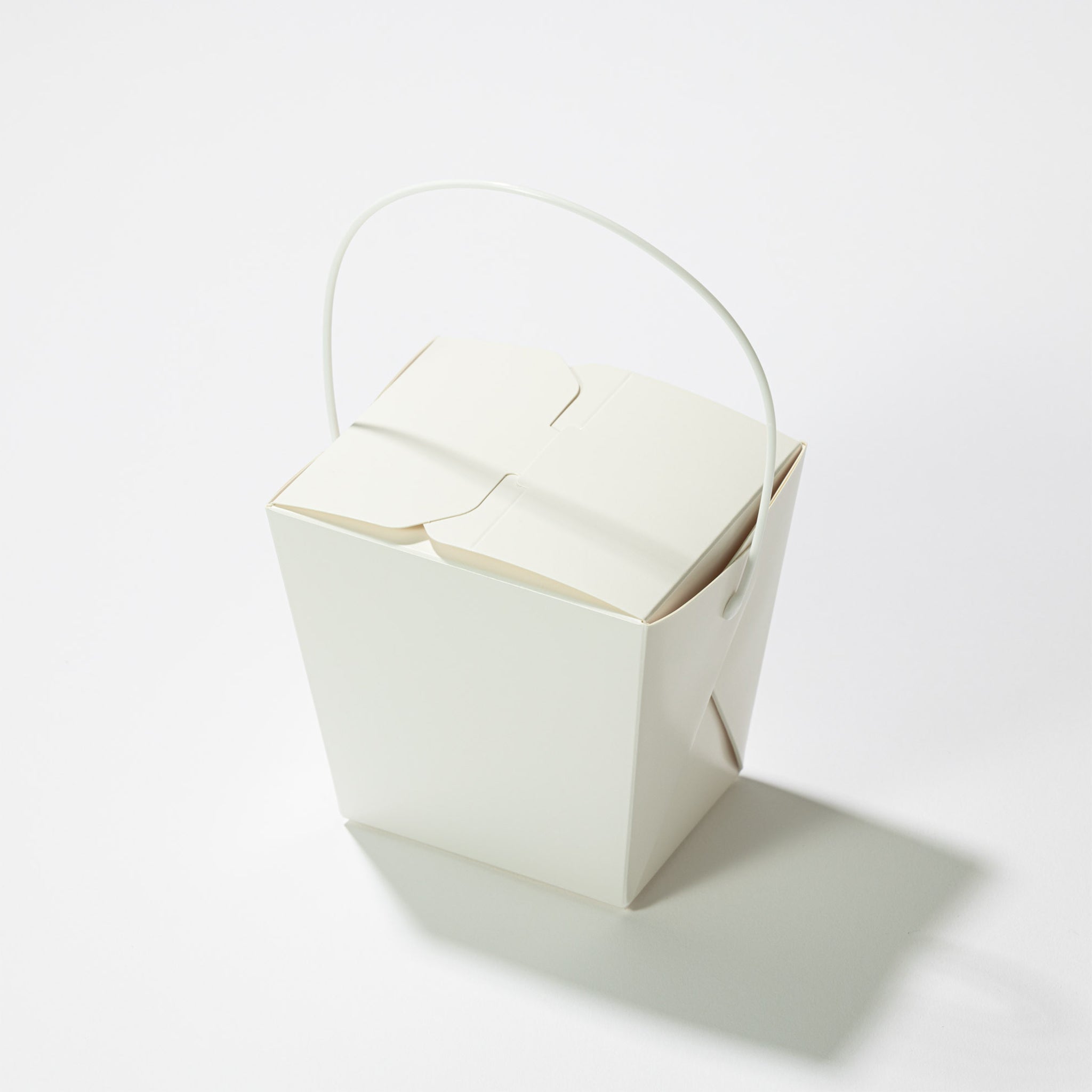 商品説明:耐水性・耐油性に優れたテイクアウト容器。プラスチック製ハンドルを採用することで、電子レンジ加熱にも対応。見た目の清潔感と実用性を兼ね備えた、飲食店・ケータリングにも最適なキューブ型ボックスです。